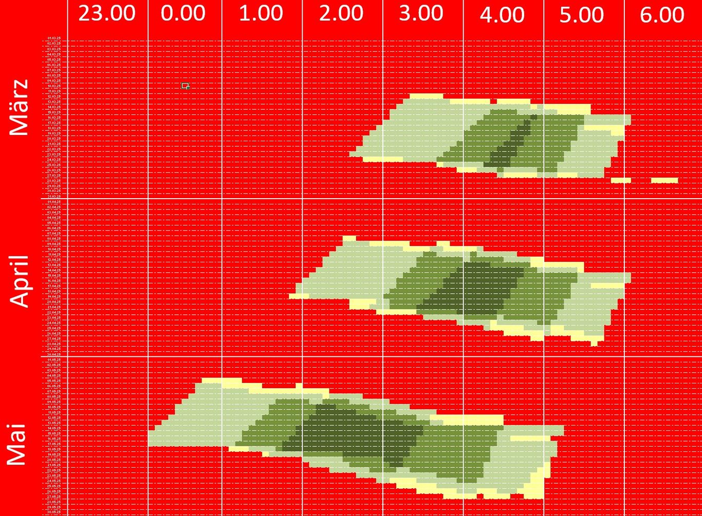 Man sieht hier sehr schön, wie sich die Zeiten mit den besten Bedingungen zügig Richtung Mitternacht bewegen.